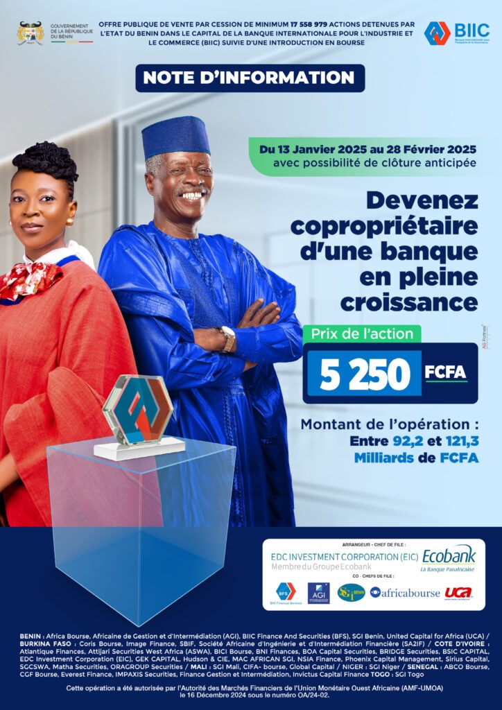 NSIA FINANCE vous invite à souscrire à l’Offre Publique de Vente de la Banque Internationale pour l’Industrie et le Commerce – BIIC, du 13 janvier au 28 février 2025 avec possibilité de clôture anticipée. L’action est proposée au prix de 5.250 F CFA. Pour lire la note d’information, Télécharger la note Pour lire le dépliant, Télécharger le […]