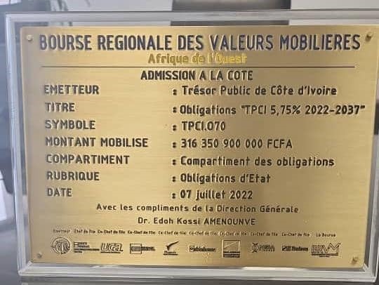 NSIA FINANCE,CO-CHEF DE FILE de la plus importante levée de fonds de l’histoire de l’Etat de Côte d’Ivoire, a pris part le jeudi dernier à la cérémonie de première cotation de l’emprunt obligataire ‘’TPCI 5,75% 2022-2037’’, à la salle de cotation du siège de la Bourse Régionale des Valeurs Mobilières (BRVM). Cette cérémonie de cotation a consacré l’admission en bourse des titres issus de cet emprunt, sous le symbole TPCI.O70. Lancée du 13 au 27 avril 2022, l’emprunt obligataire a mobilisé un montant total de 316,35 milliards FCFA.